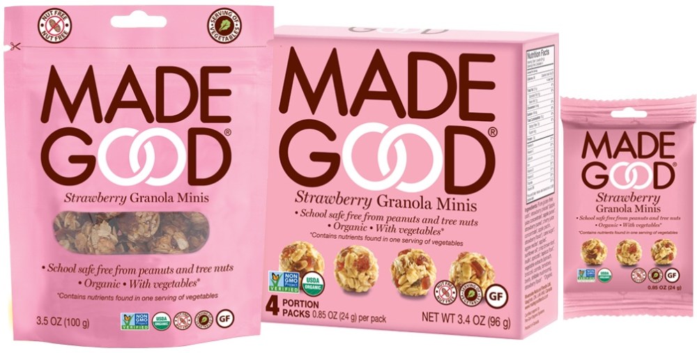 The Made Good Granola minis are available in a variety of flavors, including Strawberry , Chocolate Chip, chocolate banana, and Apple Cinnamon. The Granola minis are available in single serve packs, as well as multi-portion bags, which is also super convenient.