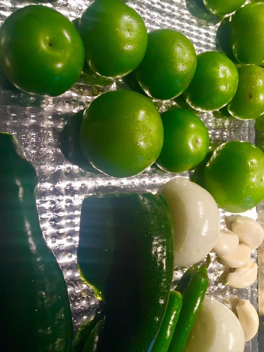 1.) Set oven to broil. Arrange tomatillos, peppers, onion, and garlic on an ungreased baking sheet. Roast in preheated oven for a few minutes, until veggies start to brown and blister. Turn veggies occasionally during cooking.