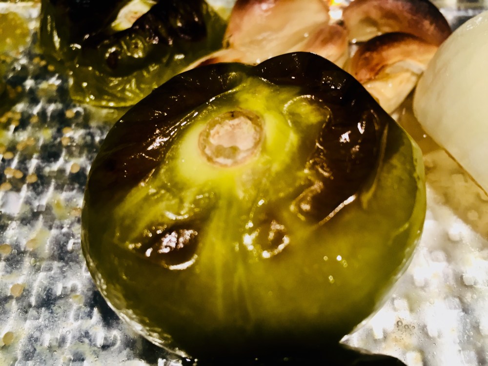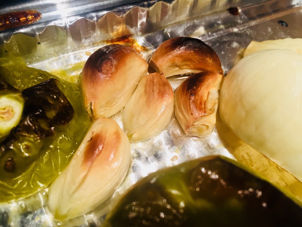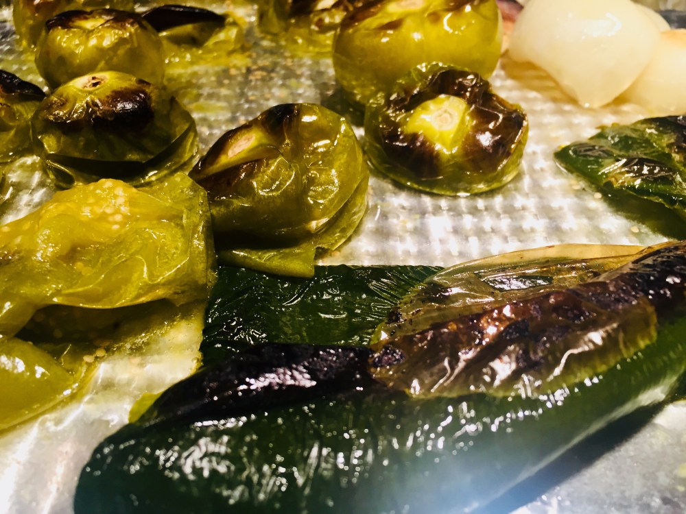 Specifically, you should roast the veggies until the peppers, and onions are starting to brown and blister, the tomatillos are golden, and starting to brown, and the garlic is browned. All veggies should be very tender at this point, as well.